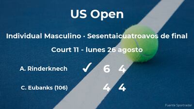 Arthur Rinderknech, francés venció por 6-4 y 4-4 al tenista estadounidense Christopher Eubanks, número 106 de la ATP, en los sesentaicuatroavos de final del torneo de Nueva York. Tras este resultado, veremos al vencedor del partido en los treintaidosavos de final del torneo de Nueva York.