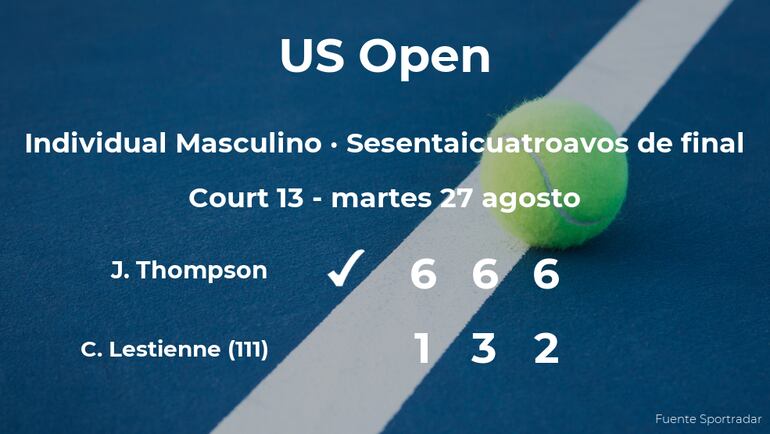 Jordan Thompson, australiano ganó en los sesentaicuatroavos de final del torneo de Nueva York por 6-1, 6-3 y 6-2 al jugador francés Constant Lestienne, número 111 de la ATP. Tras este resultado, seguiremos de cerca la trayectoria del jugador en los treintaidosavos de final del torneo.