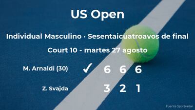 El italiano Matteo Arnaldi, número 30 de la ATP y cabeza de serie número 30, ganó por 6-3, 6-2 y 6-1 a Zachary Svajda, tenista estadounidense en los sesentaicuatroavos de final del torneo de Nueva York. Con este resultado, veremos al ganador del partido en los treintaidosavos de final del torneo de Nueva York.