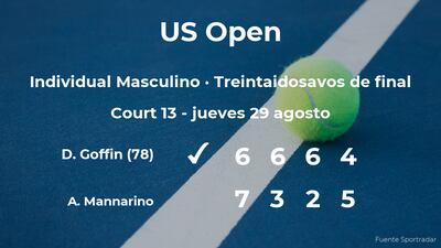 David Goffin, belga, número 78 de la ATP, venció en los treintaidosavos de final del torneo de Nueva York por 6(8)-7(10), 6-3, 6-2 y 4-5 a Adrian Mannarino, tenista francés. Tras este resultado, podremos seguir viendo al vencedor del partido en la siguiente fase del torneo de Nueva York, los dieciseisavos de final.