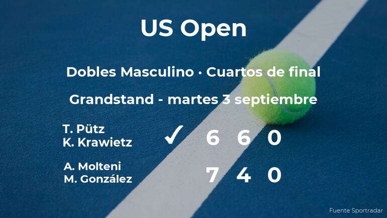 Tim Pütz y Kevin Krawietz ganaron por 6(11)-7(13), 6-4 y 0-0 (para romper el empate) a los jugadores argentinos Andrés Molteni y Máximo González en los cuartos de final del torneo de Nueva York. Tras este resultado, Pütz y Krawietz logran clasificarse para las semifinales del torneo de Nueva York.
