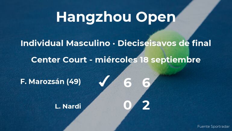 El tenista húngaro Fábián Marozsán, número 49 de la ATP y cabeza de serie número 7, venció en los dieciseisavos de final del torneo de Hangzhou por 6-0 y 6-2 a Luca Nardi, tenista italiano. Con este resultado, veremos al ganador del partido en los octavos de final del torneo de Hangzhou.