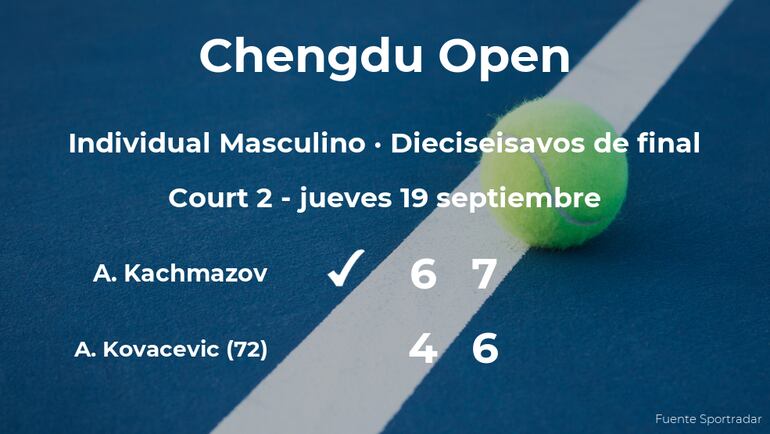 Alibek Kachmazov, ruso venció en los dieciseisavos de final del torneo de Chengdu por 6-4 y 7(9)-6(7) al estadounidense Aleksandar Kovacevic, número 72 de la ATP. Tras este resultado, podremos seguir viendo al vencedor del partido en la siguiente fase del torneo de Chengdu, los octavos de final.