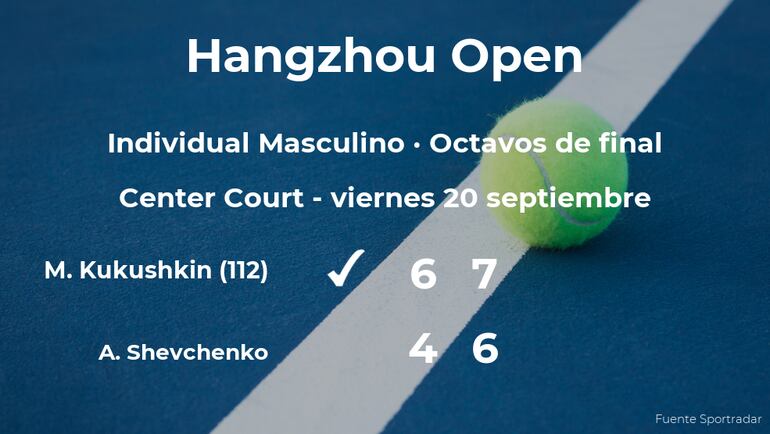El kazajo Mikhail Kukushkin, número 112 de la ATP, venció por 6-4 y 7(7)-6(3) a Alexander Shevchenko, tenista kazajo en los octavos de final del torneo de Hangzhou. Tras este resultado, seguiremos viendo al vencedor del partido en la siguiente ronda del torneo de Hangzhou.