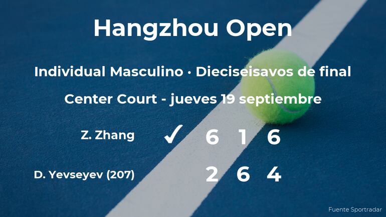 Zhizhen Zhang, chino y cabeza de serie número 6, ganó en los dieciseisavos de final del torneo de Hangzhou por 6-2, 1-6 y 6-4 al kazajo Denis Yevseyev, número 207 de la ATP. Tras este resultado, podremos seguir viendo al ganador del partido en la siguiente fase del torneo de Hangzhou, los octavos de final.