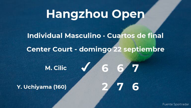 Marin Cilic, ganó por 6-2, 6(4)-7(7) y 7(7)-6(5) al tenista japonés Yasutaka Uchiyama, número 160 de la ATP, en los cuartos de final del torneo de Hangzhou. Tras este resultado, veremos al vencedor del partido en la siguiente fase del torneo de Hangzhou.
