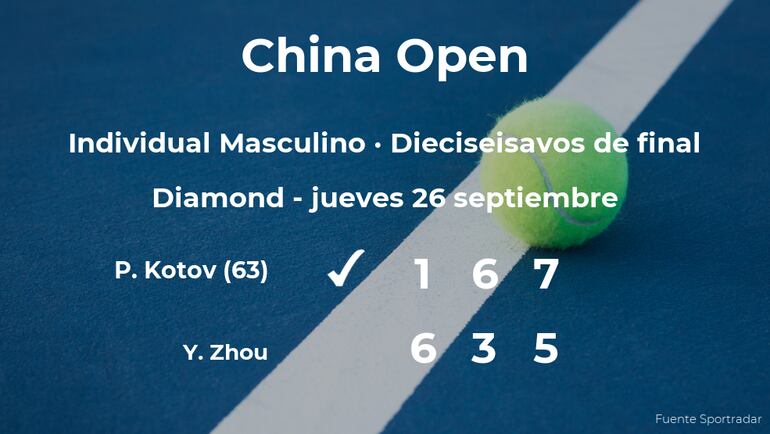 El ruso Pavel Kotov, número 63 de la ATP, ganó por 1-6, 6-3 y 7-5 a Yi Zhou, tenista chino en los dieciseisavos de final del torneo de Pekín. Con este resultado, seguiremos viendo al ganador del partido en la siguiente fase del torneo de Pekín, los octavos de final.