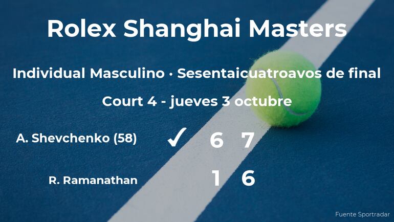 El jugador kazajo Alexander Shevchenko, número 58 de la ATP, ganó por 6-1 y 7(7)-6(3) a Ramkumar Ramanathan, tenista indio en los sesentaicuatroavos de final del torneo de Shangai. Con este resultado, veremos al ganador del partido en los treintaidosavos de final del torneo de Shangai.