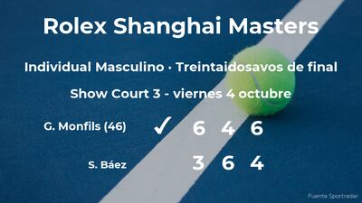 El tenista francés Gaël Monfils, número 46 de la ATP, ganó en los treintaidosavos de final del torneo de Shangai por 6-3, 4-6 y 6-4 al jugador argentino Sebastián Báez y cabeza de serie número 22. Con este resultado, podremos seguir viendo al vencedor del partido en la siguiente fase del torneo de Shangai, los dieciseisavos de final.