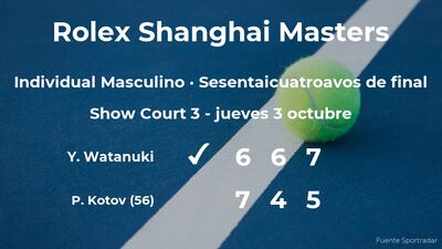 Yosuke Watanuki, japonés venció por 6(6)-7(8), 6-4 y 7-5 al ruso Pavel Kotov, número 56 de la ATP, en los sesentaicuatroavos de final del torneo de Shangai. Tras este resultado, seguiremos de cerca la trayectoria del jugador en los treintaidosavos de final del torneo.