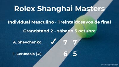 El tenista kazajo Alexander Shevchenko venció en los treintaidosavos de final del torneo de Shangai por 7(9)-6(7) y 7-5 al jugador argentino Francisco Cerúndolo, número 31 de la ATP y cabeza de serie número 27. Con este resultado, veremos al ganador del partido en los dieciseisavos de final del torneo de Shangai.