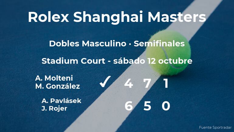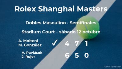 Los argentinos Andrés Molteni y Máximo González vencieron por 4-6, 7-5 y 1-0 (para desempatar el partido) al tenista checo Adam Pavlásek y Jean-Julien Rojer en las semifinales del torneo de Shangai. Tras este resultado, seguiremos de cerca la trayectoria de los jugadores durante la final de la competición.