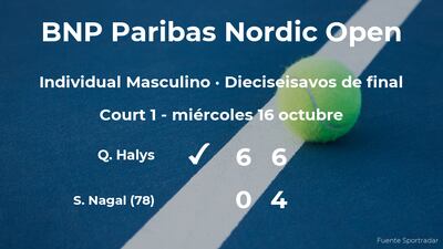 El francés Quentin Halys venció en los dieciseisavos de final del torneo de Estocolmo por 6-0 y 6-4 al jugador indio Sumit Nagal, número 78 de la ATP. Con este resultado, seguiremos viendo al vencedor del partido en la siguiente fase del torneo de Estocolmo, los octavos de final.