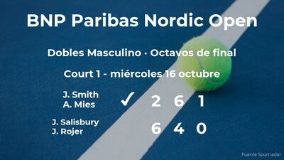El tenista australiano John-Patrick Smith y Andreas Mies ganaron en los octavos de final del torneo de Estocolmo por 2-6, 6-4 y 1-0 (tras un desempate a 10 puntos en el tercer set) al jugador británico Joe Salisbury y Jean-Julien Rojer. Tras este resultado, seguiremos viendo a los ganadores del partido en la siguiente fase del torneo de Estocolmo, la siguiente fase.