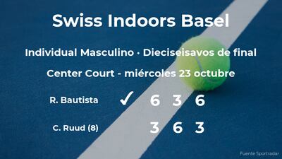 El jugador español Roberto Bautista venció en los dieciseisavos de final del torneo de Basilea por 6-3, 3-6 y 6-3 al jugador noruego Casper Ruud, número 8 de la ATP y cabeza de serie número 2. Con este resultado, seguiremos viendo al vencedor del partido en los octavos de final del torneo de Basilea.
