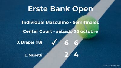 El tenista británico Jack Draper, número 18 de la ATP y cabeza de serie número 7, venció por 6-2 y 6-4 al italiano Lorenzo Musetti y cabeza de serie número 6, en las semifinales del torneo de Viena. Tras este resultado, podremos seguir viendo al vencedor del partido en la siguiente fase del torneo de Viena, la siguiente ronda.