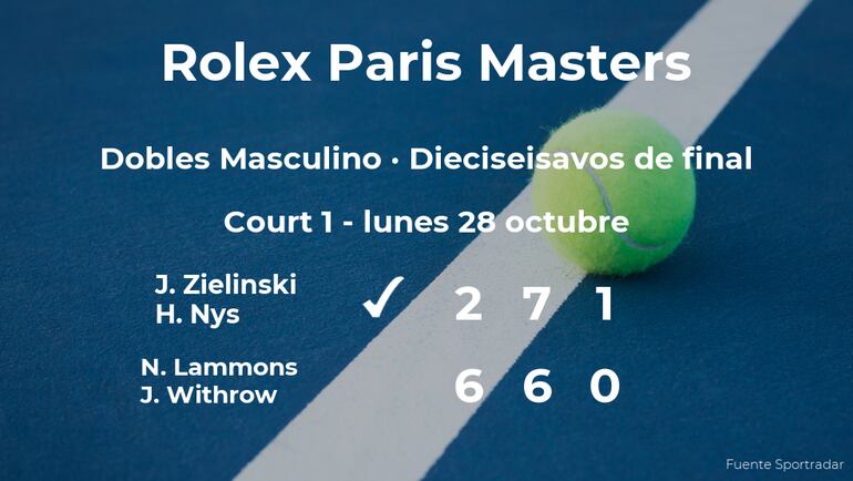 El jugador polaco Jan Zielinski y Hugo Nys ganaron por 2-6, 7(7)-6(5) y 1-0 (tras un desempate a 10 puntos en el tercer set) a los jugadores estadounidenses Nathaniel Lammons y Jackson Withrow en los dieciseisavos de final del torneo de París. Con este resultado, seguiremos viendo a la pareja vencedora en los octavos de final del torneo de París.