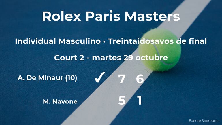 Alex De Minaur, australiano, número 10 de la ATP y cabeza de serie número 9, venció en los treintaidosavos de final del torneo de París por 7-5 y 6-1 al jugador argentino Mariano Navone. Con este resultado, podremos seguir viendo al ganador del partido en los dieciseisavos de final del torneo de París.