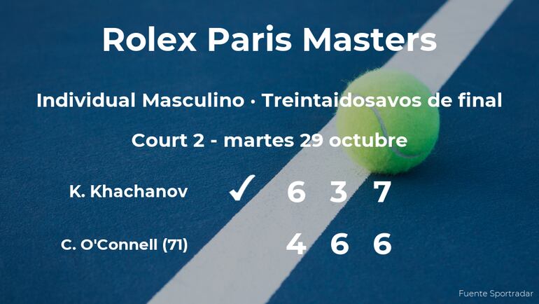 Karen Khachanov, ruso ganó por 6-4, 3-6 y 7(8)-6(6) al jugador australiano Christopher O'Connell, número 71 de la ATP, en los treintaidosavos de final del torneo de París. Tras este resultado, seguiremos viendo al vencedor del partido en la siguiente fase del torneo de París, los dieciseisavos de final.