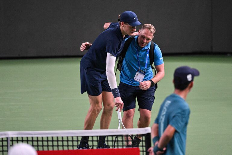 Dañado en la parte interior del muslo derecho, Jannik Sinner se marchó de la pista de Shanghái con una visible cojera, ayudado por el médico.