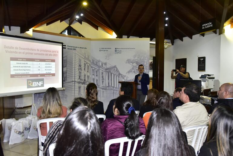 Durante la presentación, el gerente departamental Néstor Crosta manifestó que el Banco Nacional de Fomento (BNF) dispone actualmente de varias alternativas crediticias para asistir a las personas y familias que buscan soluciones habilitacionales en cuanto a compra de vivienda terminada, compra de duplex, departamento, construcción en lote propio, ampliación, refacción, incluso equipamiento de la vivienda y compra de lotes.