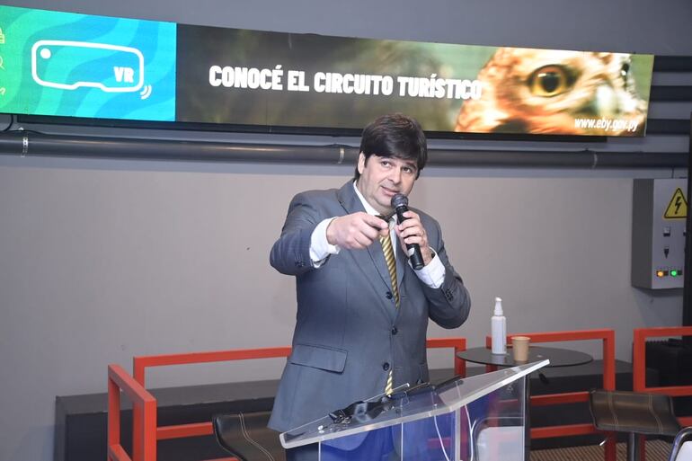 En el stand de Yacyretá en la Expo 2023 se lleva a cabo un ciclo de charlas , en cuyo contexto, en la mañana de este viernes, 21 de julio, el Ing. Roque Mendoza, responsable de la maquinización de la nueva central expuso sobre los avances de la obra del Aña Cuá y su impacto en el desarrollo y en la producción energética de la Entidad Binacional Yacyretá (EBY).