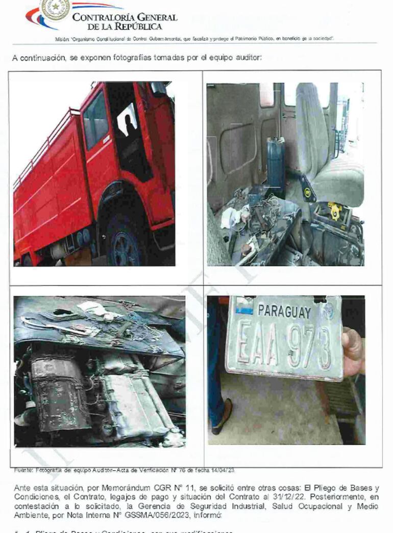 Según el ente de control, la petrolera pública pagó G. 299.997.987 durante el Ejercicio Fiscal 2022, concretamente el 20 de diciembre del 2022, por la “reparación mayor” del camión hidrante Fiat 619, que se encontraba en desuso y desmantelado en un taller que no correspondía.
