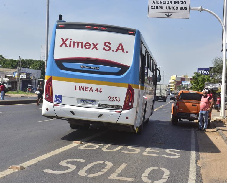 Sí se encontró una camioneta del Ministerio de Obras Públicas y Comunicaciones (MOPC) que obstaculizaba el paso de los buses, ya que estaba estacionada en el carril exclusivo para los colectivos y con el motor en marcha.