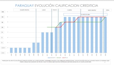 Las tres principales calificadoras del mundo, Moody’s, Fitch, y Standard & Poor’s, tienen una escala de calificación crediticia de 20 grados, contó Ferreira, y las diez categorias más bajas, de 1 a 10, son denominadas “categorías de inversión especulativas”, mientras que las diez más altas, de 11 a 20, son llamadas de “grado de inversión”. Paraguay está en el peldaño 10 del primer grupo y solo debe avanzar uno más para entrar el grupo de “los países ganadores”, donde se va el 90% de los principales fondos de inversión del mundo.