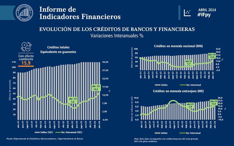 Cabe mencionar, que al mes de mayo del presente año, el monto de la cartera de créditos bancarios en el sistema paraguayo alcanzó alrededor de US$ 20.265 millones, con un crecimiento cercano al 15% con respecto al año 2023.