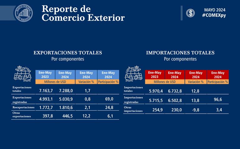 De acuerdo con el reporte de comercio exterior del Banco Central del Paraguay (BCP), las exportaciones totales al mes de mayo del 2024, alcanzaron un valor de US$ 7.288,0 millones, que representa un incremento del 1,7% en comparación a los US$ 7.163,7 millones observados a mayo del año anterior.