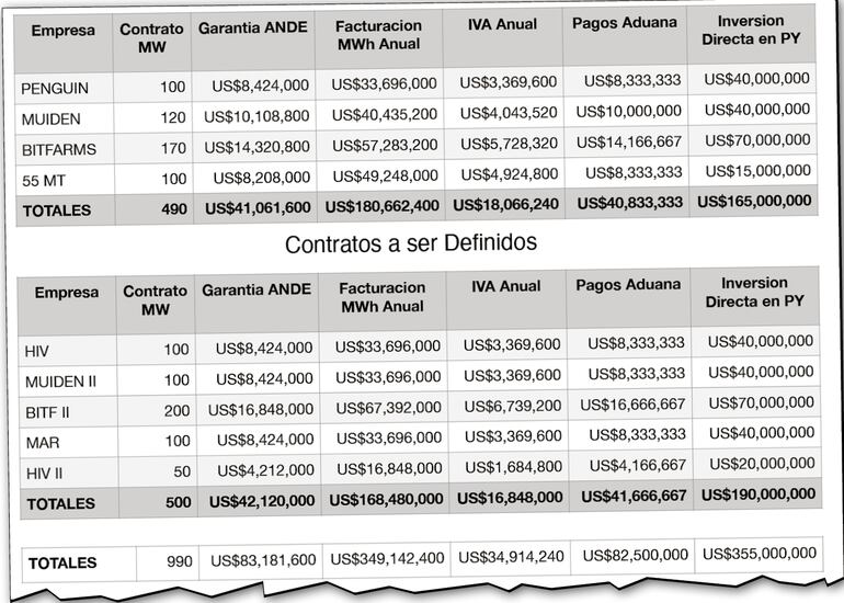 Agregó que también existen 55 mineras instaladas en Media Tensión, que suman otros 100 MW en total de consumo, con inversiones de US$ 150.000 por cada MW en promedio en infraestructura, que suman US$ 15 millones y entre US$ 70 millones y US$ 80 millones en máquinas. “Estas empresas en su mayoría son de ciudadanos paraguayos o de paraguayos en Join Venture con empresas extranjeras”, comentó.