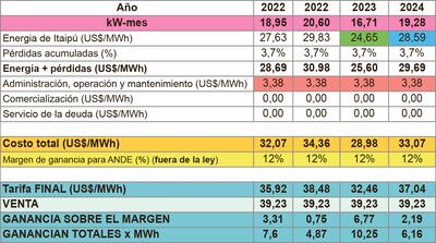 Según el especialista y consultor del sector eléctrico, Ing. Nelson Cristaldo, ANDE quiere mantener su margen bruto de 37,17%. “El margen bruto es lo que le cuesta a la ANDE comprar de Itaipú versus lo que vende. Es decir, ese 37,17% es el resultado de los US$ 39,23 -precio al que la ANDE vende a las criptos-, menos US$ 24,65 (con la tarifa de 16,71KW-mes) por 100, que es lo que le cuesta la energía de Itaipú”, detalló.