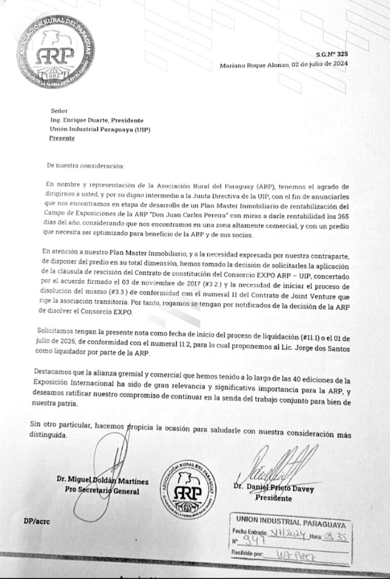 “Destacamos que la alianza gremial y comercial que hemos tenido a lo largo de las 40 ediciones de la Exposición Internacional ha sido de gran relevancia y significativa importancia para la ARP, y deseamos ratificar nuestro compromiso de continuar en la senda de trabajo conjunto para el bien de nuestra patria”, dice la nota de ARP a la UIP.