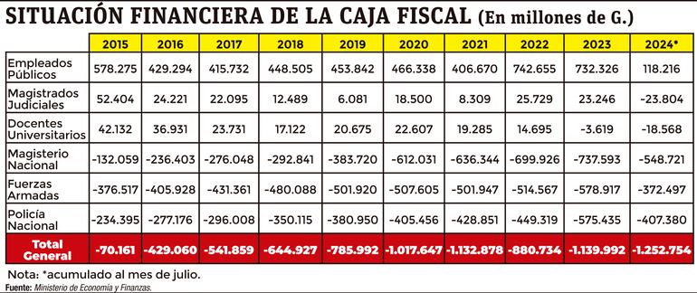 La Caja Fiscal viene arrastrando déficit global desde 2015 y en este ejercicio completará 10 años consecutivo de pérdidas; aunque mucho antes determinados sectores, como docentes, militares y policías, ya estaban en saldo rojo; pero aún así hasta 2014 cerraba los ejercicios anuales con superávit global.