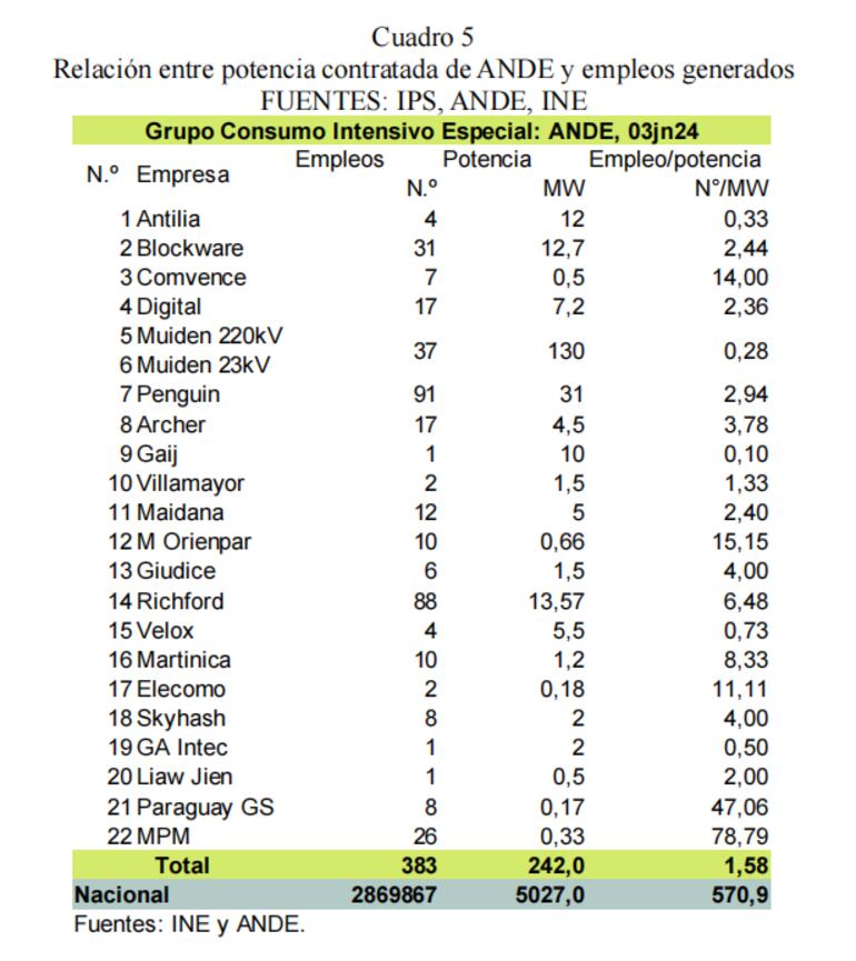 El empleo creado por criptomineras y similares, según registra el IPS, llega apenas a 383 personas (o bien, 1,58 empleos/MW), resalta el informe. Añade que para una potencia contratada por el Grupo de Consumo Intensivo Especial, considerando tan sólo a las empresas que declaran a sus asegurados al IPS, y su potencia contratada respectiva (242 MW) se determina que este grupo genera 1,58 empleos/MW.