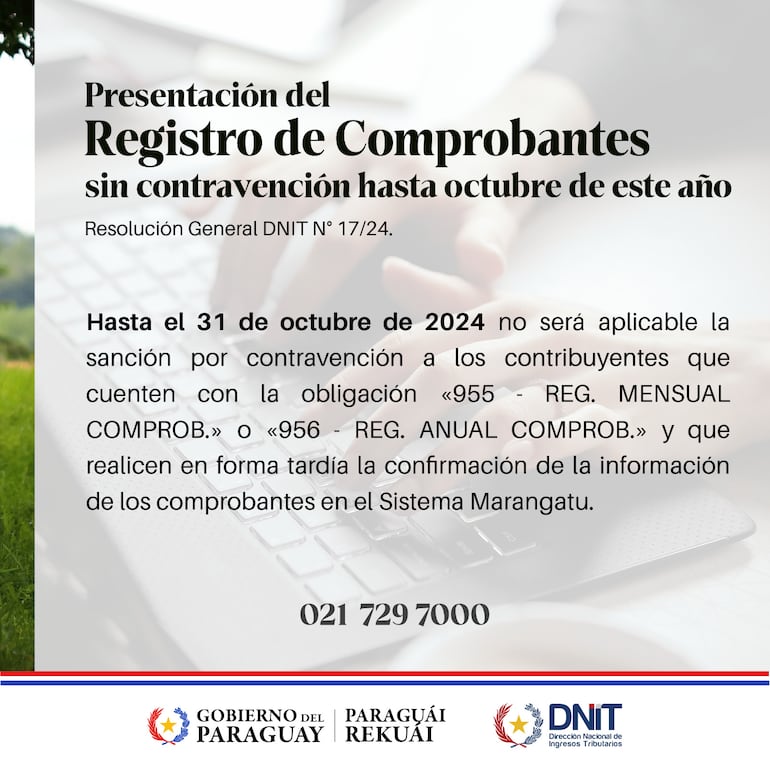 La Dirección Nacional de Ingresos Tributarios (DNIT) emitió esta tarde la Resolución General DNIT N.° 17/24 que establece que hasta el 31 de octubre de 2024 no será aplicable la multa de contravención por confirmación en forma tardía de la información de los comprobantes en el Sistema Marangatu. De esta forma se amplía el tiempo de gracia para que los contribuyentes de IVA, IRP y afines puedan cumplimiento este requerimiento de la RG 90 sin multa por presentación tardía.