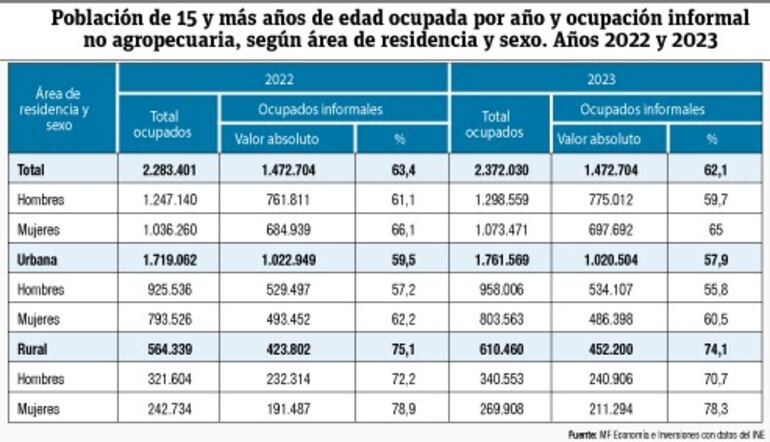 El empleo informal sigue afectando a más del 60% de la población trabajadora del país. Incluye a empleados y obreros públicos, así como del sector privado, trabajadores domésticos que no aportan al sistema de jubilación o pensión, independiente de la situación de la empresa donde trabaja. Además, a los patrones o empleadores y trabajadores por cuenta propia, cuya empresa no está inscripta en el Registro Único de Contribuyentes (RUC), así como trabajadores familiares no remunerados, independientemente de que la empresa donde trabaja tenga o no RUC, de acuerdo con la Organización Internacional del Trabajo (OIT) y ajustado a la situación de Paraguay.