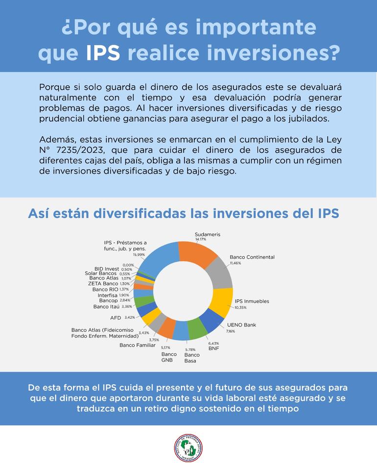 En menos de un año de creación ueno bank ya acapara el 7,1% del total de las inversiones globales del IPS ( de G. 19 billones o equivalente a US$ 2.520 millones) y representan el 11% del total del sistema financiero. O sea las inversiones de la previsional en ueno llegan a cerca de G. 1,34 billones (US$ 179 millones), de acuerdo con datos publicados ayer por el Instituto de Previsión Social (IPS) en sus redes sociales, en una clara campaña de apoyo a ueno bank por los casos publicados.