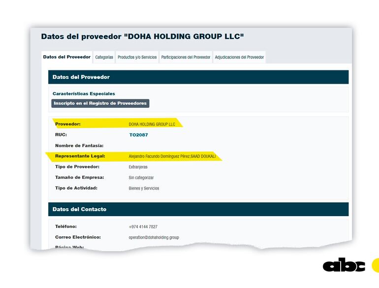 La empresa se inscribió solo para esta convocatoria en el portal de la Dirección Nacional de Contrataciones Públicas (DNCP). En el registro de la DNCP figuran como representantes de la compañía Alejandro Facundo Domínguez Pérez (hijo del presidente de la Conmebol Alejandro Domínguez) y Saad Doukali.