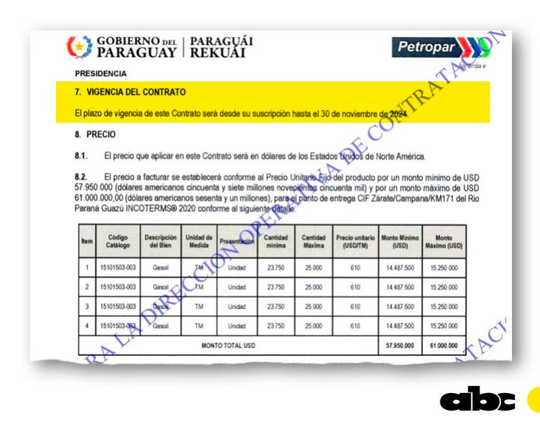 Según las bases y condiciones y el contrato firmado, la primera tanda del gasoil (25.000 toneladas métricas) debió entregarse entre el 23 y 25 de octubre del año pasado, en Campana, Km 171 del Río Paraná, Guazú, en la República Argentina (modalidad CIF).