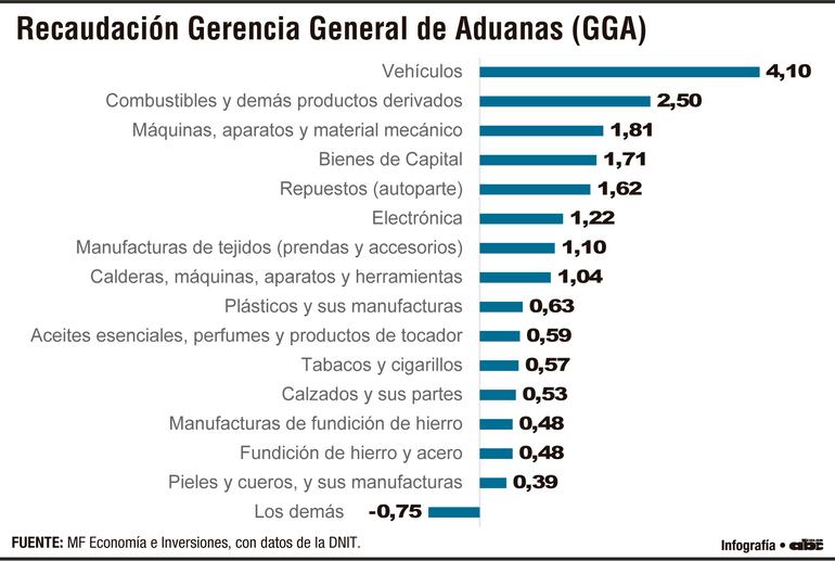 En el análisis de los datos de la Gerencia General de Aduanas, los vehículos representaron el principal motor de crecimiento, aportando un significativo 4,1%, lo que podría explicarse por el aumento de las importaciones de vehículos, que responde a una combinación de factores: recuperación del consumo tras la pandemia, acceso a financiamiento más flexible y una posible anticipación de compras ante expectativas de ajustes arancelarios o cambios en políticas de importación.