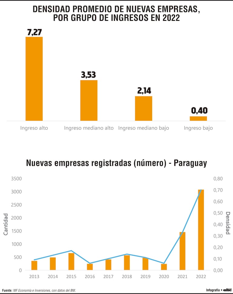 Uno de los hallazgos más relevantes es la disparidad entre grupos de ingreso. A los últimos datos disponibles, las economías de ingreso alto alcanzaron una densidad de nuevas empresas de 7,27 por cada 1.000 adultos. En cambio, las economías de ingreso bajo apenas llegaron a 0,40 por cada 1.000 adultos, es decir, una diferencia de más de 18 veces entre ambos extremos. Esta brecha revela no solo una menor formalización empresarial en los países de menores ingresos, sino también un amplio margen de crecimiento en términos de dinamismo emprendedor.