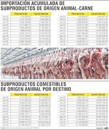 Al comparar año a año, se observa que prácticamente todos los meses de 2025 superan de manera holgada los niveles alcanzados en 2024. La infografía muestra que los valores más significativos se concentran en el último trimestre, donde los totales casi duplican los de la comparación interanual directa. En términos anuales, los datos sugieren que 2025 cerrará como un año récord de importación de carne y subproductos, tanto por volumen como por valor y por la diferencia frente al comportamiento del mercado el año previo.