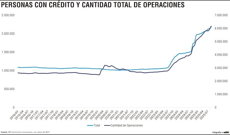 Este último punto resulta clave: el crecimiento de las operaciones fue más acelerado que el aumento de personas con crédito. Mientras la cantidad de personas prácticamente se duplicó en el período, las operaciones lo hicieron en una magnitud aún mayor, patrón que sugiere una diversificación de productos, plazos más cortos o una utilización más intensiva del crédito por parte de los mismos usuarios.