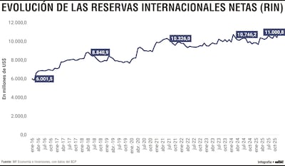 En 2025 la tendencia descendente se profundizó. Desde US$ 9.851,7 millones en enero, las RIN bajaron hasta US$ 9.684,6 millones en febrero, luego repuntaron hasta US$ 10.372,2 millones en marzo, pero posteriormente retomaron una trayectoria de debilitamiento. Para noviembre de 2025, las reservas se ubicaban en US$ 10.420,7 millones, y en diciembre aumentaron a US$ 11.000,8 millones.
