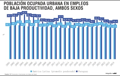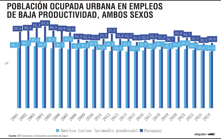 Bajo este marco, los datos de la CEPAL sobre “la población ocupada urbana en empleos de baja productividad, ambos sexos” muestran que Paraguay presenta, de manera persistente, una proporción de población urbana ocupada en empleos de baja productividad significativamente superior al promedio de América Latina. En 2001, mientras el promedio regional se ubicaba en 46,7%, Paraguay alcanzaba el 59,4%. Esta brecha se mantuvo a lo largo de más de dos décadas, reflejando una característica estructural del mercado laboral paraguayo.