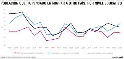 A comienzos de la década de 2000, los niveles de intención migratoria resultaban elevados, en especial entre quienes contaban con educación secundaria y superior. En 2002, el 28% de la población con secundaria y el 40% de quienes tenían educación superior afirmaban haber pensado en emigrar. La brecha con el grupo de primaria era significativa, ya que este último se ubicaba en 17%. Este patrón refleja que, en contextos de limitadas oportunidades laborales calificadas, los sectores con mayor formación perciben con mayor claridad la posibilidad de mejorar su situación económica en el exterior.