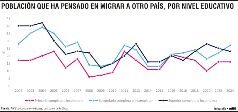 De acuerdo con los datos de la Comisión Económica para América Latina y el Caribe (CEPAL), la evolución del porcentaje de personas de 18 años y más que ha pensado en ir a vivir a otro país, desagregada por nivel educativo, permite identificar con mayor precisión qué grupos sociales perciben mayores limitaciones en el país y cuáles encuentran mejores oportunidades para desarrollarse sin necesidad de emigrar. Los datos muestran tres trayectorias diferenciadas: la población con primaria completa o incompleta, la que cuenta con secundaria completa o incompleta y aquella con educación superior completa o incompleta. Cada una de ellas expresa una relación distinta entre educación, expectativas laborales y evaluación de las condiciones estructurales del país.