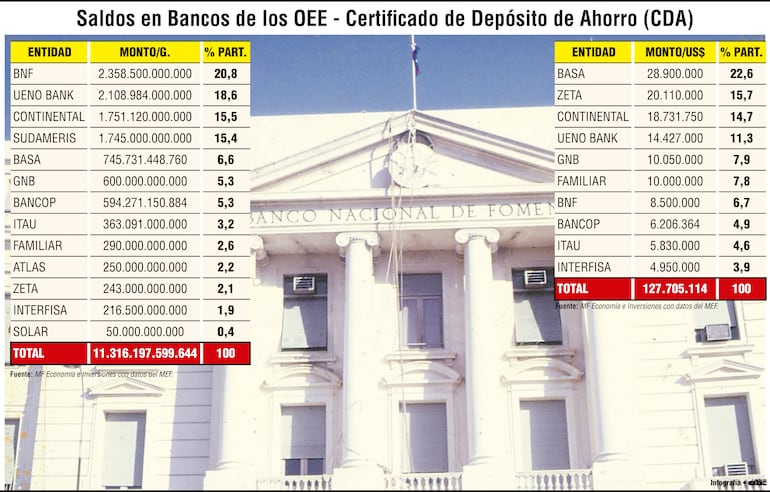 El Banco Nacional de Fomento (BNF) encabezó con claridad esta clasificación, al concentrar G. 2,358 billones, equivalentes al 20,8% del total de los CDAs. Este liderazgo consolida su posición histórica como principal receptor de fondos públicos en moneda local, coherente con su carácter de banca estatal y su estrecha vinculación con la gestión financiera del sector público. Muy cerca se ubicó Ueno Bank, con G. 2,108 billones y una participación del 18,6%, lo que confirma su fuerte inserción en el negocio de captación de recursos del Estado. En tercer lugar, Continental, con G. 1,751 billones, que representó el 15,5%, seguido por Sudameris, con G. 1,745 billones y el 15,4%.